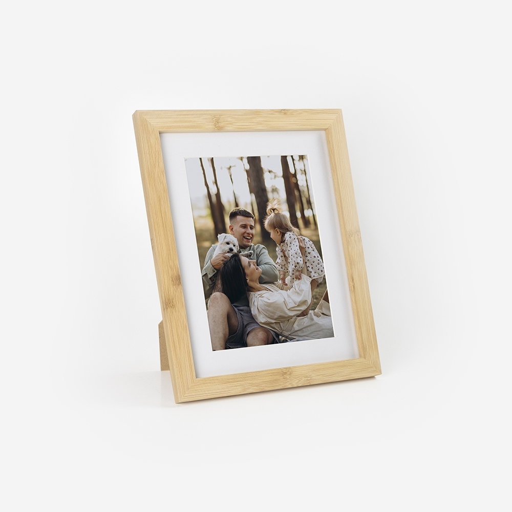 Moldura de alta qualidade, fabricada em madeira 100% Bamboo, garantindo durabilidade e um acabamento perfeito para destacar as tuas fotos.